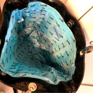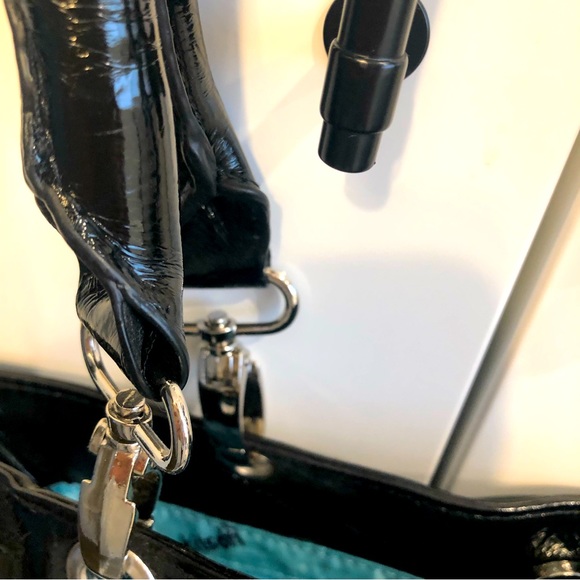 Kitson Los Angeles Authentic Tote Bag. NEW with Tag/Never used. Authentic from KITSON store in Los Angeles. Shiny Faux Patent Leather. Approximate Measurements: 13”width/14” height/3” depth/8.5” strap-drop. Beautiful “Tiffany blue” interior. Interior zippered pocket plus two non-zippered interior pockets. Detachable handles.