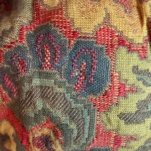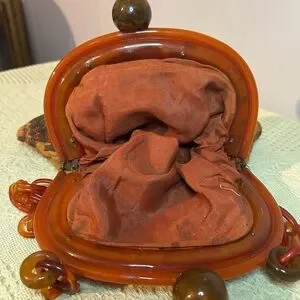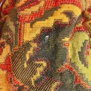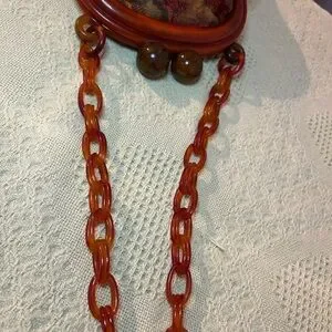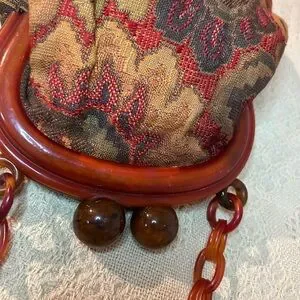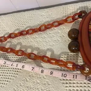 Features a mix of red, brown, and tan hues. Includes a stylish “chain” handle.