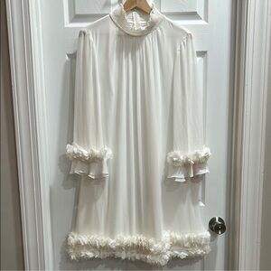 Stylish Alex Marie mini dress. Chiffon-style cream fabric with floral-like detail in sleeves and hem. Versatile and chic.