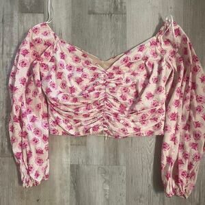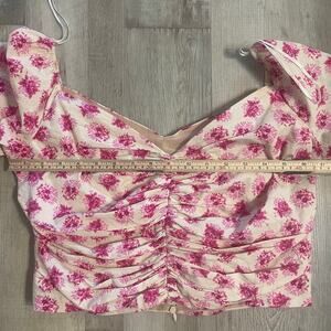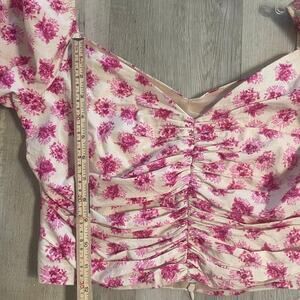 Zara Pink Floral Off The Shoulder Bardot Top Size Large. Ruched detail with Sweetheart neckline and Puffy shoulders. Hidden back zipper. Perfect for spring and summer.