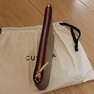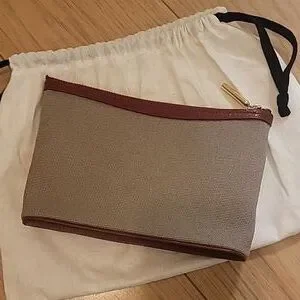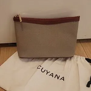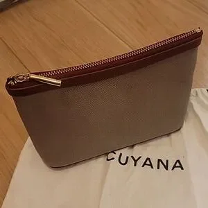 Chic Cuyana pouch in tan canvas with deep red leather trim. Features a sleek gold zipper. Never used. Comes with tag and dust bag.