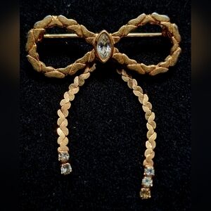 Elegant gold bow brooch featuring sparkling rhinestones. Perfect for adding a touch of glamour. Excellent condition. Approximately 2" long, 1 1/2" wide.