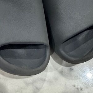 Comfortable Yeezy slide sandals. Sleek black design. Perfect for casual wear.