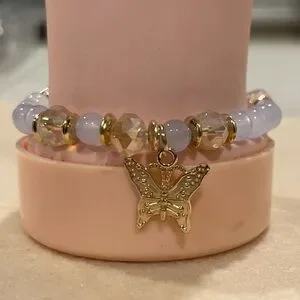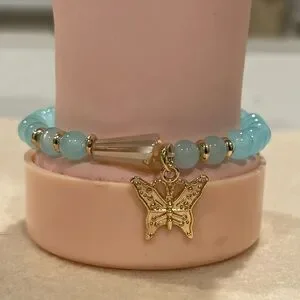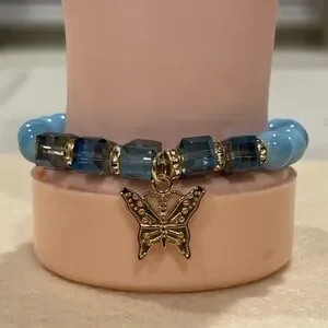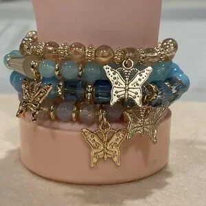 Elegant bracelet set featuring gold butterfly charms and blue beads. Perfect for adding a touch of whimsy to any outfit.