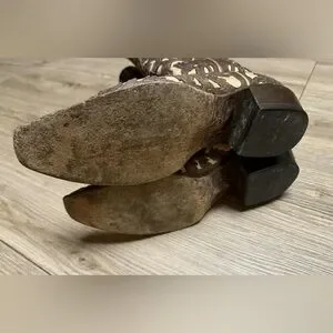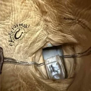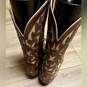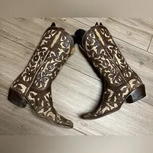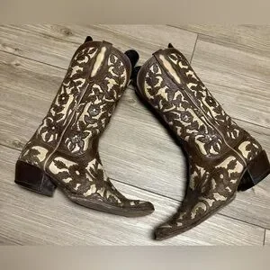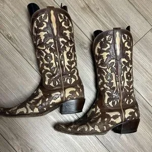 Charlie 1 Horse Lucchese Boots Womens 9 B brown Leather Western Pointed Toe Stylish cowboy boots with intricate brown and cream design. Perfect for a western look.