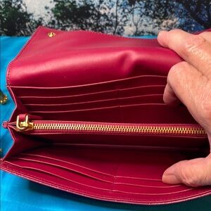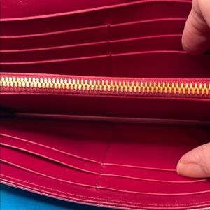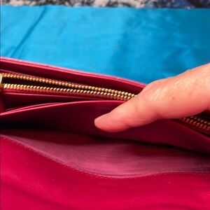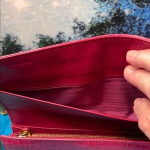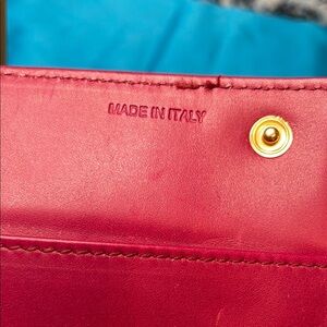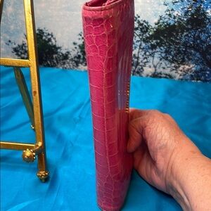 This Miu Miu wallet showcases a luxurious crocodile embossed leather texture in a vibrant pink hue, making it a standout accessory. Crafted with precision, its sleek and structured design exudes sophistication and elegance. Perfect for those who appreciate high-quality craftsmanship and bold fashion statements. Made in Italy. VGC