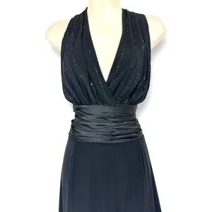 Elegant black sleeveless dress. Features a deep V-neck and fitted waist. Perfect for evening wear.