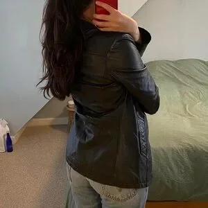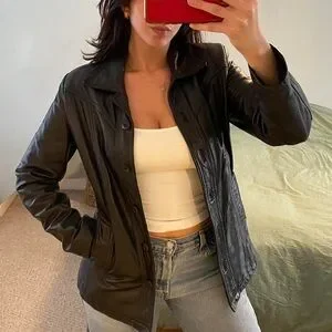 Trendy genuine black leather jacket with slimming waist detail and pockets!