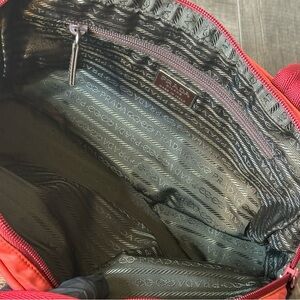 This is an authentic vintage Prada Tessuto handbag. The bag is made of red nylon and features the classic Prada triangle logo. This style of bag, often referred to as a "tote" or "satchel," was popular in the late 1990s and early 2000s. The term "tessuto" refers to Prada's signature nylon fabric.