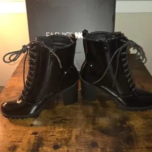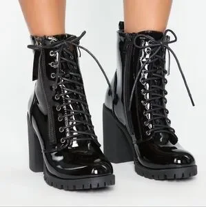 Combat booties with 3.5" high block heel and laces. Brand new from FashionNova, never worn only tried on once. Called 'Wait A Little Bit Longer' on the site. Comes in original packaging- box is a little scuffed up from delivery.