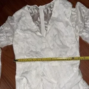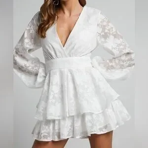 Saints + Secrets Mini Dress White Floral lace Balloon Sleeve Ruffle V-Neck S