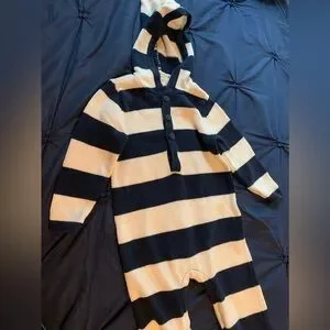 This cozy one-piece from Old Navy features a charming blue and white stripe pattern, complete with an adorable knotted snug hood for added warmth. Designed as a one piece it offers full-body coverage, ensuring comfort and style for any casual occasion. Snap crotch opening for easy diaper changes nautical blue and white striped style adorable for boys or girls!