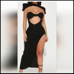 Turn heads in this particular dress it has many attractions. Boss vibes high shoulder , Open cut breast with breast pads to keep the girls in tact, high sexy split and material that curves your frame. A must have 🔥🔥🔥
