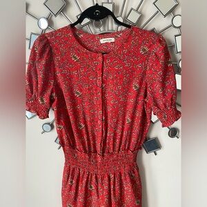 Red Floral Wide Leg XS So cute, this jumpsuit has elastic waist and elastic detailed short sleeves, cute floral design. Wide leg so cute with sandals or heels. Dress up or down.