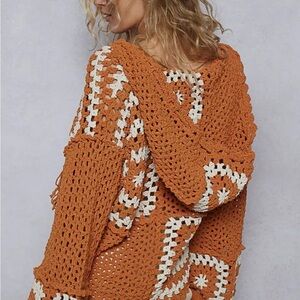 Stylish crochet sweater in orange and white. Perfect for a cozy look.