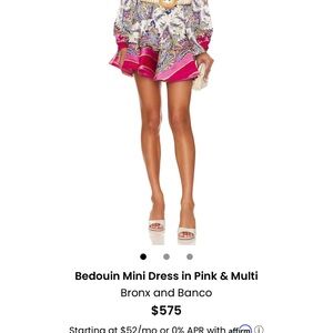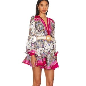 Chic mini dress with a striking pink base. Features a lively, intricate design. Flared hem and long sleeves enhance style.