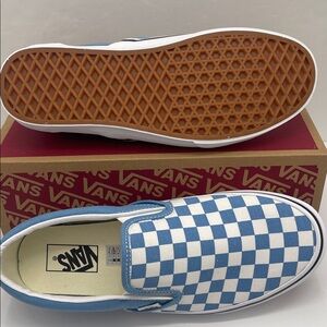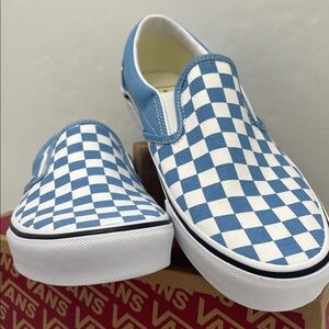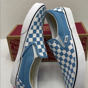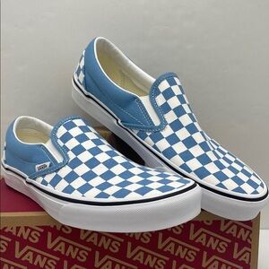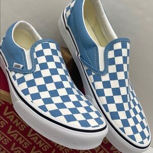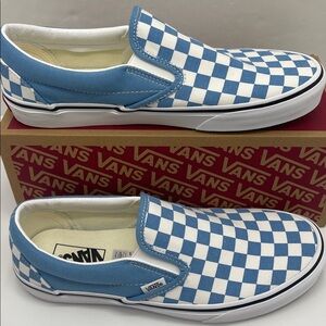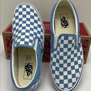 Iconic Vans slip-ons with a bold blue and white checkered design. Easy to wear and stylish.