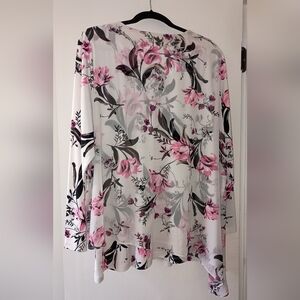 Chic floral blouse with a V-neck design. Features pink and black floral patterns on a cream, off white background. Perfect for casual or dressy occasions.