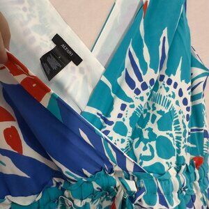 Sleeveless Silk-Inspired Dress with Blue & Orange Botanical Pattern (SIZE 6)