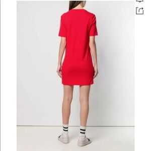 Bold RED T-shirt dress by Moschino. Features graphic text design. Perfect for casual outings.