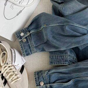 Stylish Prada denim jacket. Features a classic brown collar. Perfect for casual elegance.