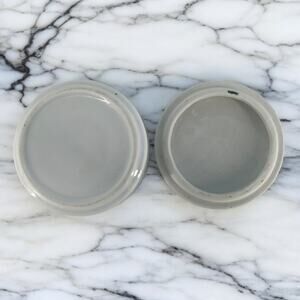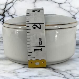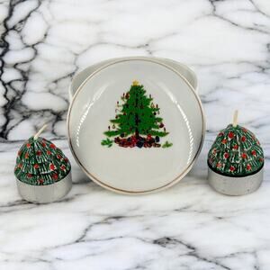 Charming trinket dish/box with lid. Lid features a festive Christmas tree design with presents and a decorative gold line around the edge. Also included are two small Christmas tree shaped tea light candles that fit neatly in the trinket box. No idea what the dish is made of. Due to light & screen variations, colors may vary slightly from the images