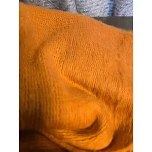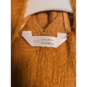 This is a pre-owned women's Lauren Conrad knit poncho shrug in a warm, muted orange color. It features an open-front design with a relaxed, draped fit and a soft, slightly fuzzy texture. Fringe detailing adorns the bottom edges of the garment. The knit pattern appears consistent throughout. The brand tag "LC LAUREN CONRAD" is clearly visible at the neckline. No significant visible imperfections such as rips or stains are apparent in the provided images.
