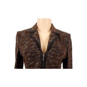 Brown and grey St. John tweed patterned skirt suit with leather trim. Jacket features a notch collar, padded shoulders and double zipper closure at front. Skirt features tonal stitching, back split and elastic waist.