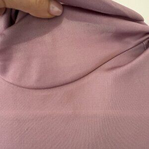 100% viscose. Made in China. Dry clean only. Unlined. Hidden back zipper closure. Turtleneck styling Attached ruched sarong with front tie closure. Optional styling Slinky jersey fabric.