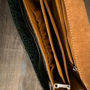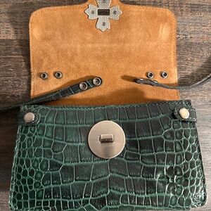 Patricia Nash dark pine green leather croc reptile pattern crossbody purse. Silver tone metal cross design fastener on outer flap. Three separate individual inner compartments with pockets. Outer back pocket with snap closure. Attached wallet. Nice and roomy, holds quite a bit for a smaller bag. In very good clean condition. Strap is adjustable and also detachable, so can be used as a clutch. Perfect for fall, winter, holidays. Measurements approximately 20.5” strap drop, 3.5” diameter bottom, 8” wide, 6.5” height. Smoke free home. Same day or next business day shipping.
