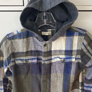 Casual plaid shirt with a hood. Features blue, gray, and white tones. Ideal for relaxed outings.
