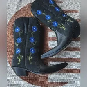 Vintage Black Needle-Toe Cowboy Boots w/ Blue Floral Embroidery