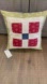 Decorative throw pillow featuring a patchwork design. Green and red accents on a cream background. Perfect for adding a cozy touch to any room. This pillow handcrafted at Sew Amazing Handcrafts what are the perfect attached to your couch, bedroom, sofa, recliner, bench. Featuring a bear paw “pattern I have designed this out of old-fashioned/antique cotton prints.