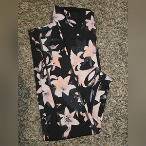 Stylish leggings with a floral pattern. Features black and pink colors. Perfect for casual wear.