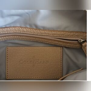 Cole Haan beige purse with a dark brown strap. Purse measures 14 wide x12 high zipper on top with side pockets. Holds a ton of stuff...