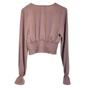 Trendy blouse with a deep V-neck. Features smocked waist and long sleeves with ruffle cuffs. 100% polyester. Like New condition. Reposhed. Size Medium.