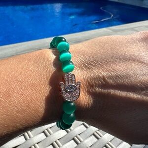Elegant green beaded bracelet featuring a sparkling Hamsa charm. Perfect for adding a touch of style to any outfit.