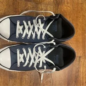 Stylish Converse sneakers. Navy canvas with white accents. Classic lace-up design.