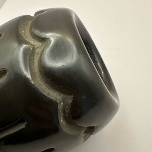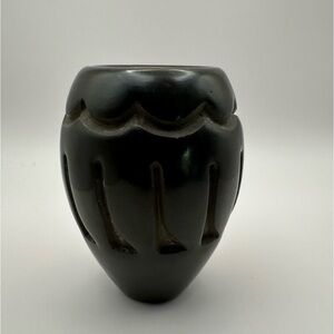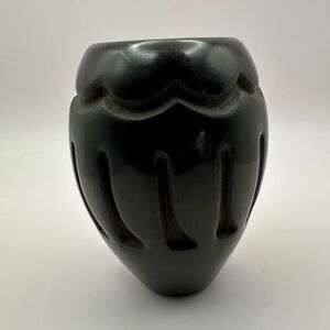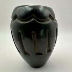 Authentic hand-carved blackware pottery from the renowned Santa Clara Pueblo artist Elaine Salazar. This beautiful piece showcases traditional Pueblo artistry with a deep black finish and wave and vertical line carvings.