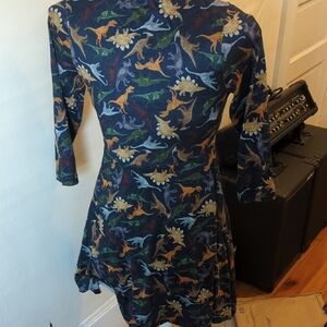 Step out in style with this playful dinosaur patterned midi dress. The rich blue fabric highlights the vibrant dinosaur design, making it a fun choice for any casual occasion.
