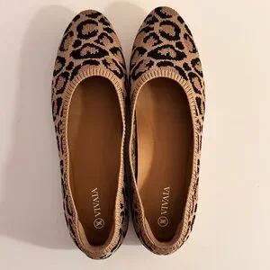 Chic Vivaia flats with a bold leopard print. Features tan and black colors.