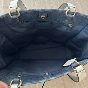 Size: 15 3/4" (L) x 14" (H) x 7 1/4" (W). Coach Ladies Dempsey Tote 40 In Signature Denim With Coach Patch. Made from a mix of Signature denim and refined pebble leather, this tote bag features a spacious interior compartment with slip pocket, zip pocket and fabric lining, snap closure, dual top handles with 6" drop, finished with gold-toned hardware.