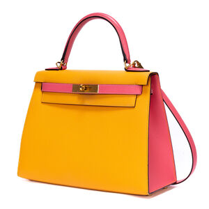 Hermès Handbag Kelly Sellier 28 in Amber/Rose Azalea Epsom Leather and Gold hardware. The product is in Excellent Condition (A).