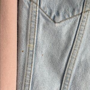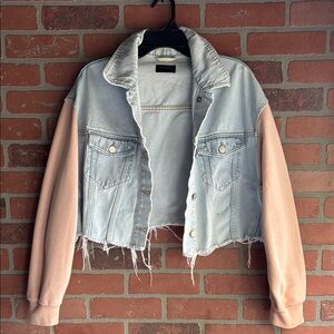 Chic All Saints jacket with a light blue denim body and soft pink sleeves. Ideal for casual wear. Good preowned condition! Has a few spots on denim and discoloration on sleeves see all pics size M/L
