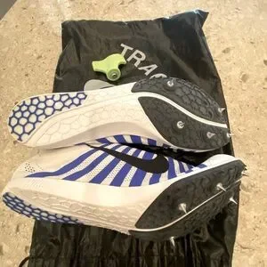Men’s Nike racing shoes in vibrant blue and white. Size 11. Ideal for competitive runners, worn once. Comes with storage bag and tool.