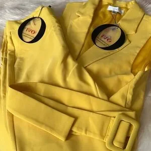 Vibrant yellow pantsuit by Ovi. Features a sleeveless blazer with a belt. Matching pants included.