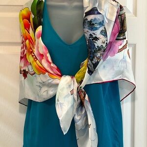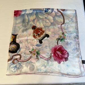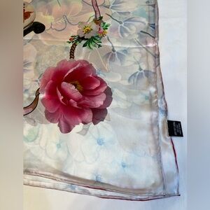 Huge fantastical silk scarf with a sky like background. Big florals and Chinese jars and a pink ribbon throughout. In great condition!