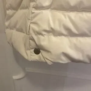 Elegant cream puffer vest with removable soft faux fur trim. Ideal for layering. Elastic strip in back for fitted look. Excellent used condition.