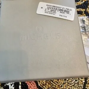 Elegant Michele watch with a silver strap and pink face. Features diamond accents.