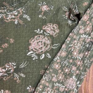 Olive green top with floral pattern. Long sleeves. Ribbed texture. Scoop neckline.